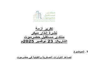 حضرموت (صوت الشعب) خاص: أصدر منتدى مستقبل حضرموت تقرير ضمن منظومة الإنذار المبكر التي يعمل عليها المنتدى لرصد التطورات الميدانية والسياسية في حضرموت، ...