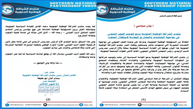 وكان البيان صادر عن: القائم بأعمال رئيس منتدى الشراكة الوطنية الجنوبية "بسام البان أبو خليفة".