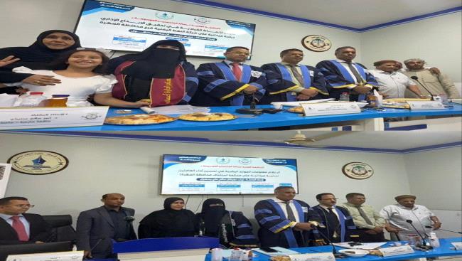 The event was attended by Mr. Owaidhan Salem Ali Yashoul, Director General of the Finance Office in Al-Mahrah Governorate, Dr. Alaa Mohammed Al-Saqqaf, Project Director at the Korea–U.S. organization Top Bio, along with a number of college deans, department heads, faculty members, researchers, colleagues, and family members from Hadhramout and Al-Mahrah who shared in celebrating this remarkable academic achievement.