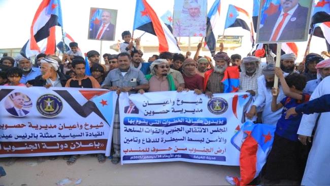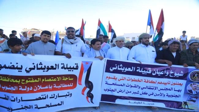 وأضاف الشيخ باكريت أن انضمام ابناء حصوين والعوبثاني إلى ساحة الاعتصام الشعبي ماهو إلا تجديد لمطالبهم في الإسراع بإعلان دولة الجنوب العربي والاستجابةً للإرادة الشعبية الحرة التي عبّرت عنها الجماهير في الساحات.