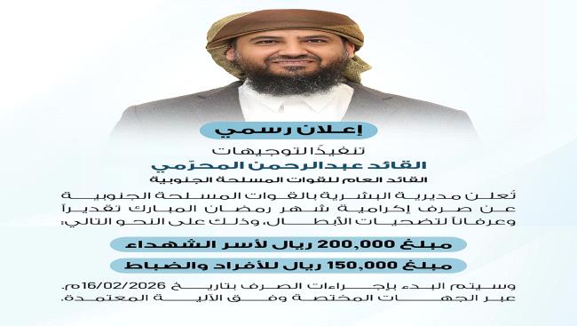 تنفيذاً لتوجيهات القائد عبدالرحمن المحرّمي، القائد العام للقوات المسلحة الجنوبية.. أعلنت مديرية البشرية العامة بالقوات المسلحة الجنوبية، عن صرف إكرامية شهر رمضان المبارك تقديراً وعرفاناً لتضحيات أبطال القوات المسلحة الجنوبية.