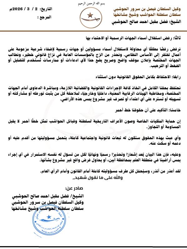 وحذّر البيان من مغبة الاستمرار في أي خطوات أحادية الجانب تهدف إلى فرض أمر واقع تحت أي مسمى، سواء استثماري أو غيره، دون الرجوع إلى أصحاب الحق، معتبرًا أن أي دخول ميداني أو أعمال تخطيط أو تقسيم أو تسوير أو بيع أو إعلان تسويقي في تلك الأراضي يُعد اعتداءً مباشرًا على ملكيات خاصة بقبائل الحواشب وشيخ مشائخها، وتتحمل الجهة القائمة به كامل المسؤولية القانونية.