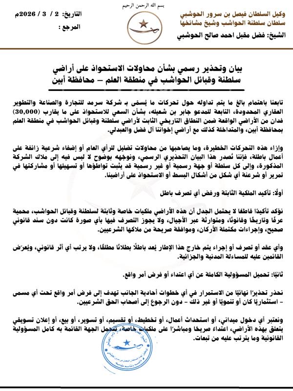 أصدر سلطان الحواشب وشيخ مشائخ قبائلها بيانًا وتحذيرًا رسميًا شديد اللهجة بشأن ما وصفه بمحاولات الاستحواذ غير المشروعة على مساحات واسعة من أراضي الحواشب التاريخية في منطقة العلم بمحافظتي أبين ولحج، والتي تُقدّر بنحو 30 ألف فدان.