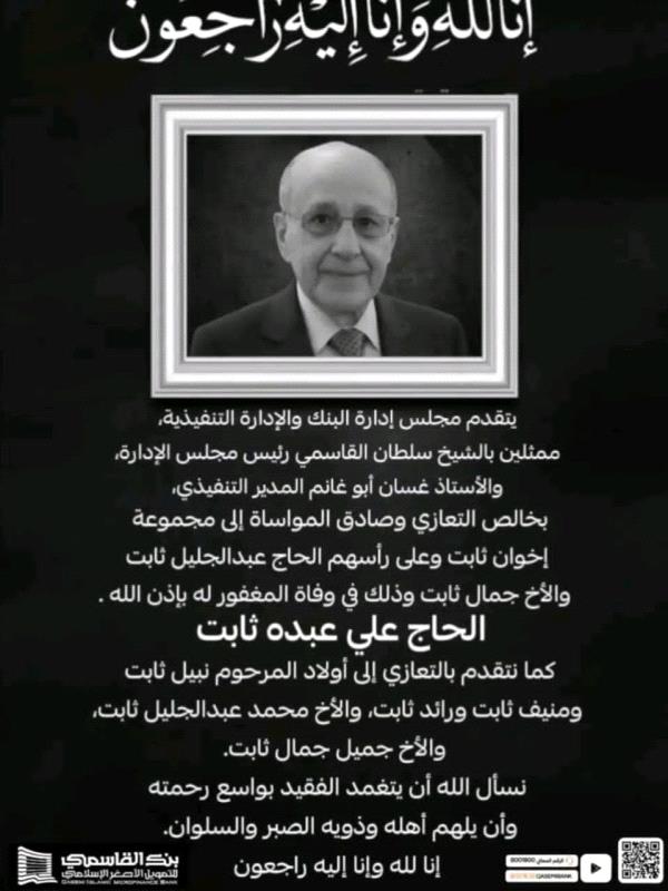 وجاء في بيان التعزية أن مجلس إدارة البنك والإدارة التنفيذية، ممثلين برئيس مجلس الإدارة الشيخ سلطان القاسمي، والمدير التنفيذي الأستاذ غسان أبو غانم، يتقدمون بأحر التعازي وعظيم المواساة إلى مجموعة إخوان ثابت، وعلى رأسهم الحاج عبدالجليل ثابت والأخ جمال ثابت، سائلين الله أن يتغمد الفقيد بواسع رحمته.