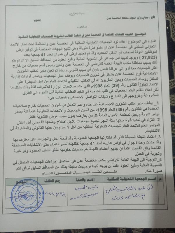 تقدمت قرابة خمسين جمعية سكنية وتعاونية في العاصمة المؤقتة عدن بشكوى رسمية إلى وكيل أول العاصمة، اتهمت فيها مدير عام مكتب الشؤون الاجتماعية والعمل بعدن بارتكاب “تجاوزات ومخالفات قانونية جسيمة” تمس عمل اتحاد الجمعيات التعاونية السكنية.